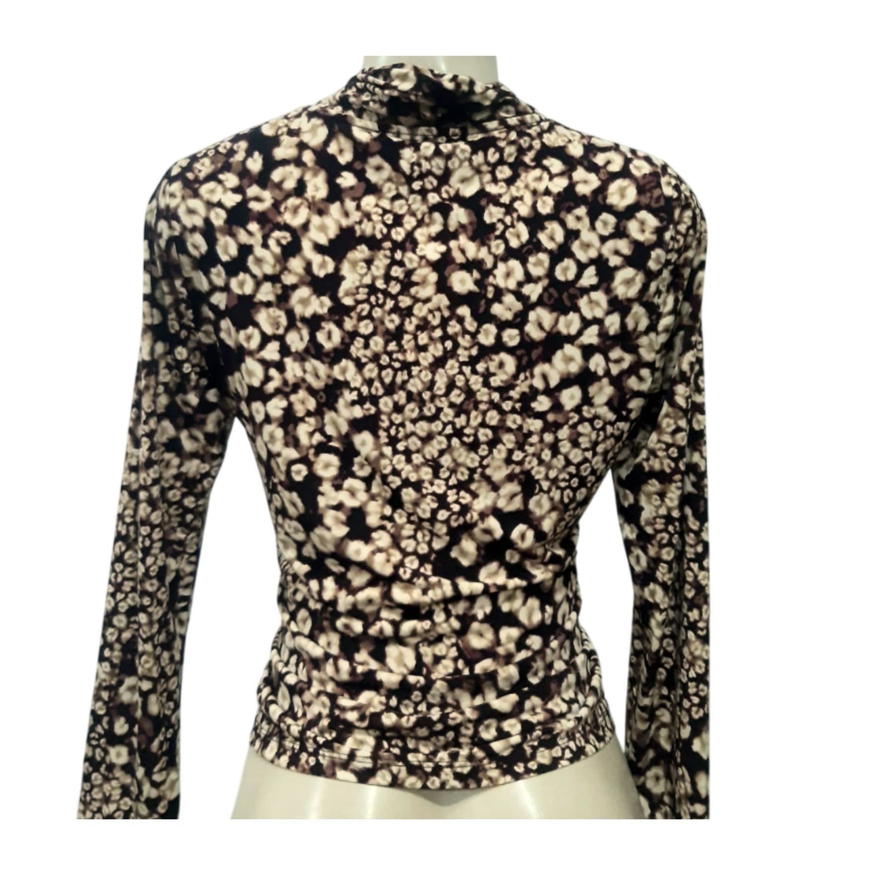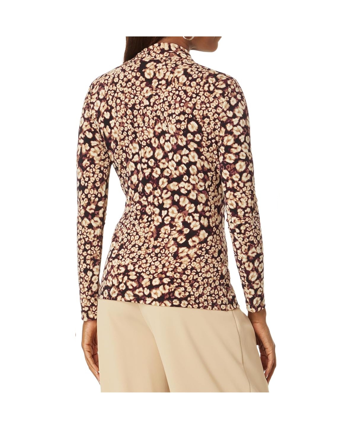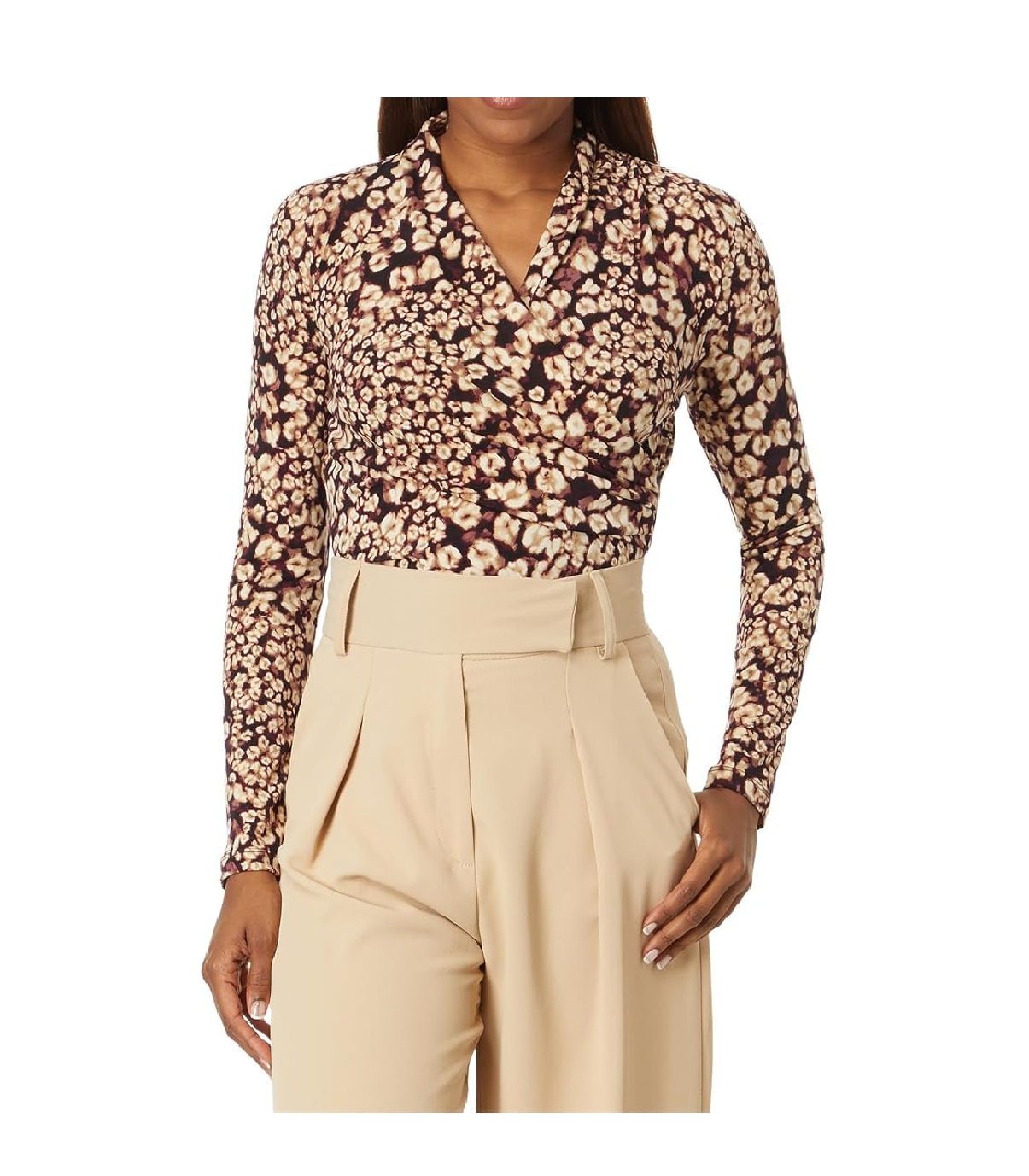 Realce o seu look diva com esta blusa de malha DKNY com estampa de oncinha e manga comprida com envoltório lateral. Esta blusa possui decote em V com sobrepeliz e bainha reta.