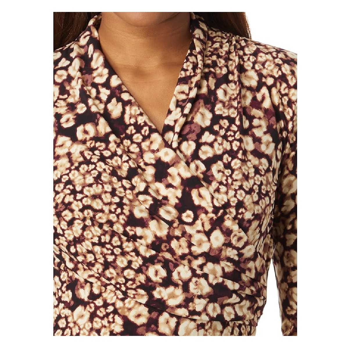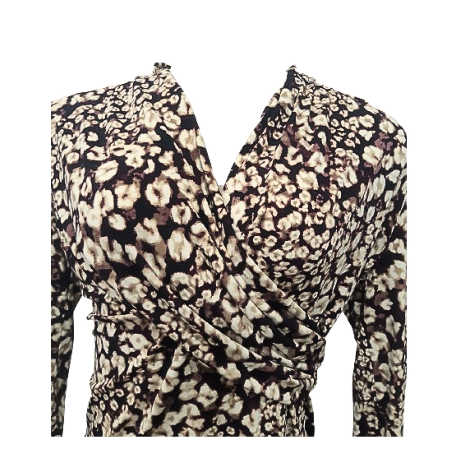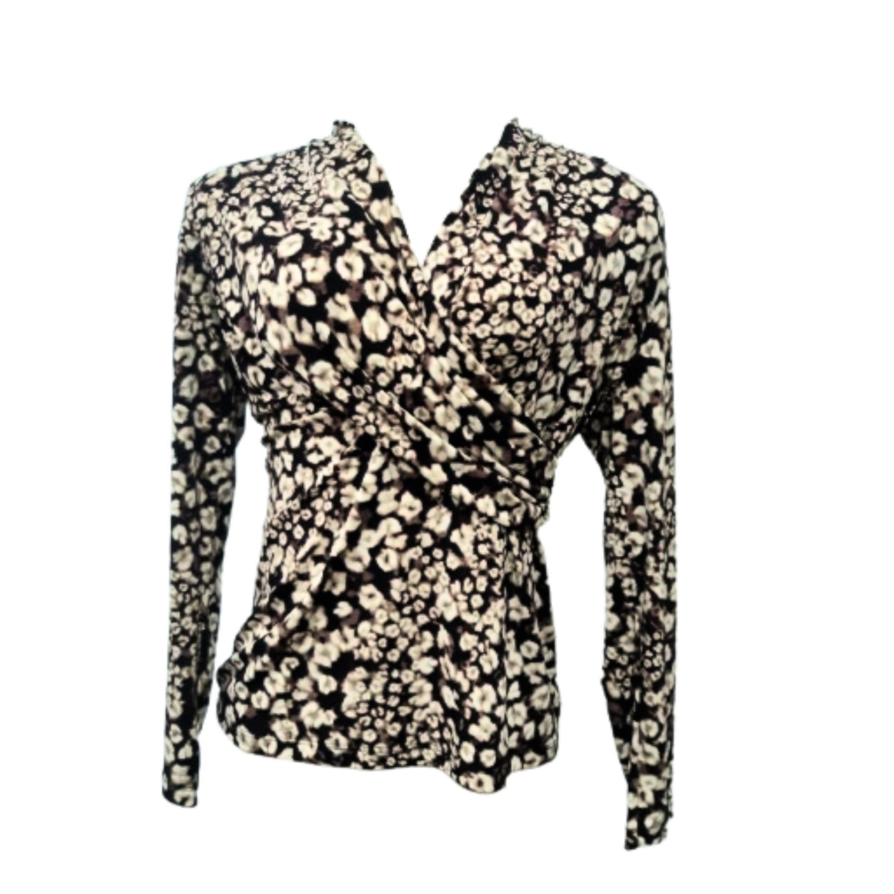 Realce o seu look diva com esta blusa de malha DKNY com estampa de oncinha e manga comprida com envoltório lateral. Esta blusa possui decote em V com sobrepeliz e bainha reta.