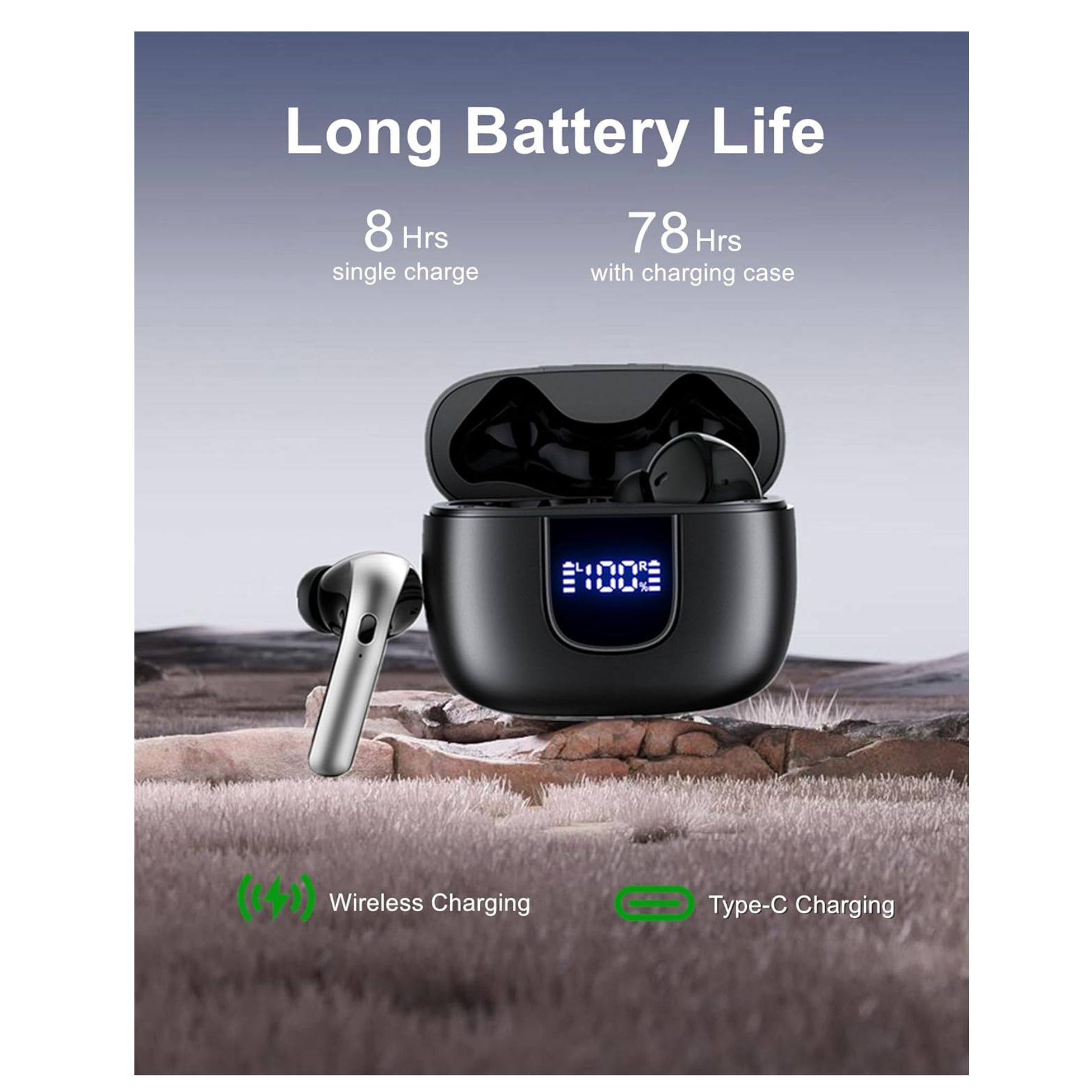 Reprodução de longa duração por 78 horas e estojo de carregamento sem fio