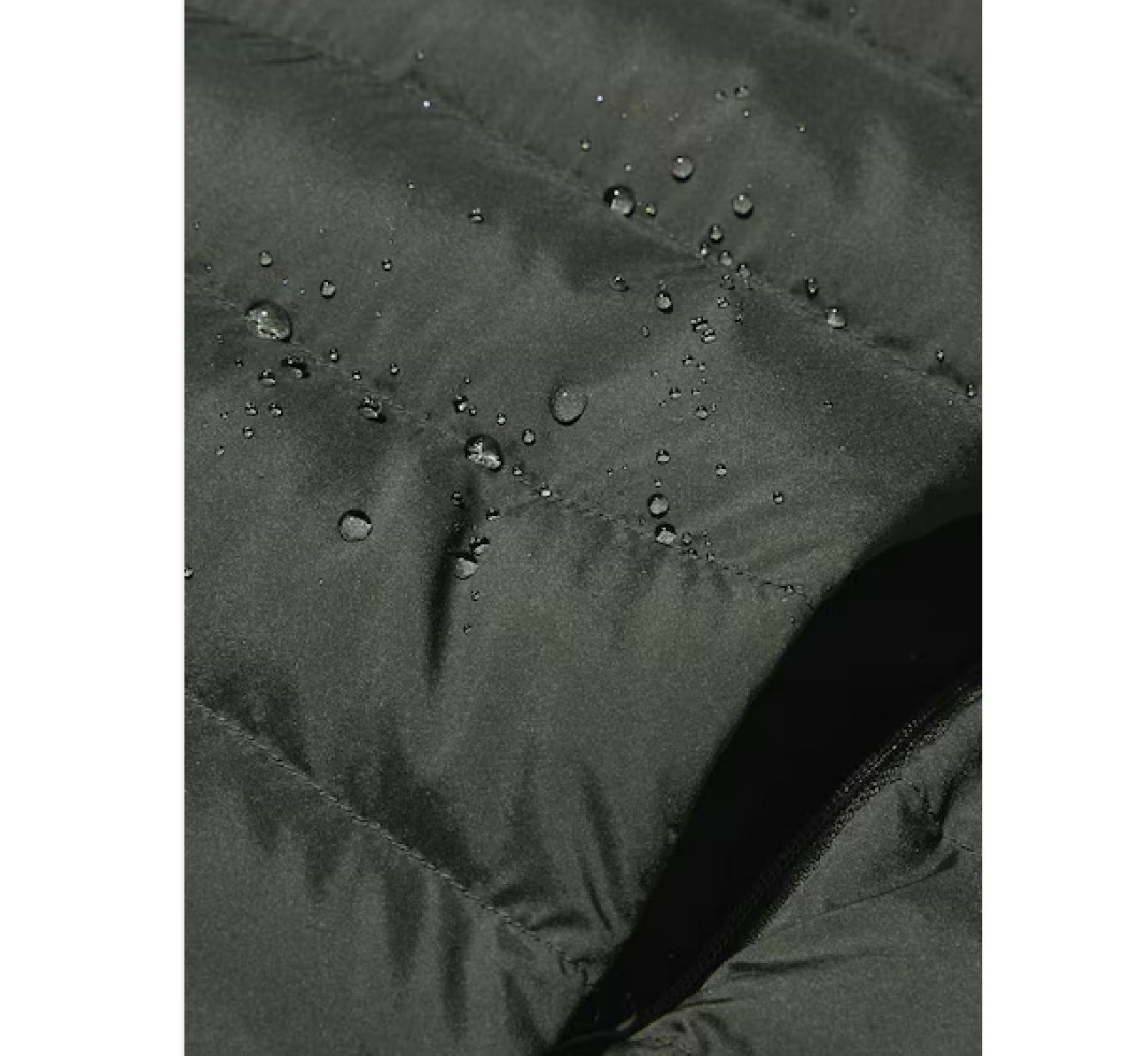 Acabamento resistente à água. O tecido é revestido com um agente repelente à água, o que prolonga o efeito. O acabamento não é permanente.