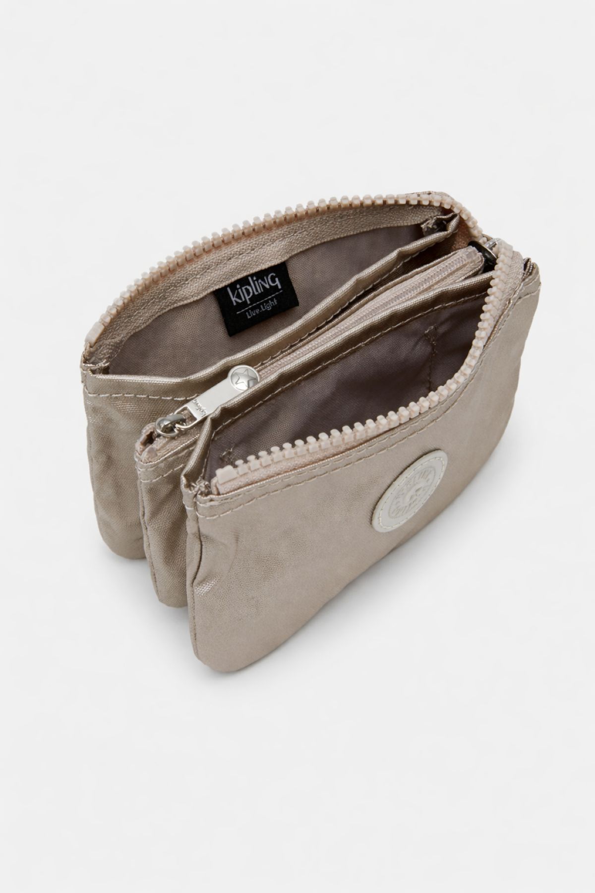 Equipada com o icônico zíper tratorado da Kipling, famoso por sua suavidade ao abrir e resistência ao uso constante. O puxador é em metal fosco com o logo da marca gravado.