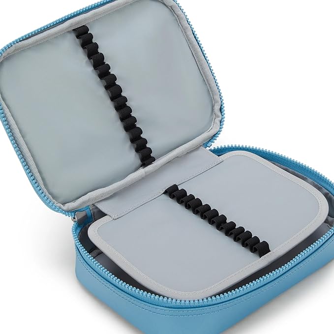 O 100 Pens é um estojo estruturado e espaçoso, o maior estojo de canetas, forte e resistente com uma divisória central que possui elástico para acomodar 26 lápis e ou canetas.